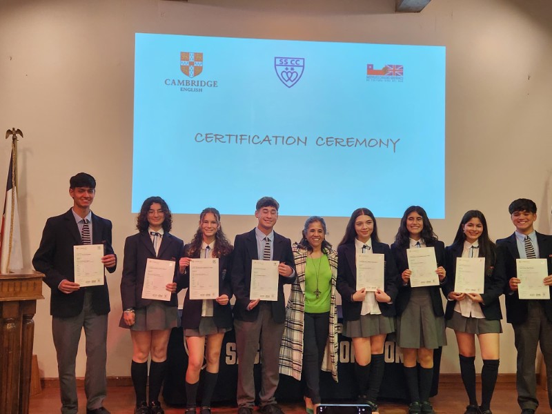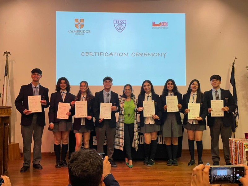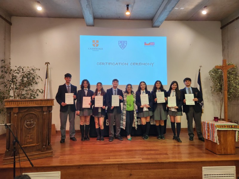 El pasado miércoles 15 de octubre, se realizó una nueva versión de la ceremonia de Certificación de Cambridge. En esta ocasión fueron 10 los estudiantes de cuarto medio, quienes luego de haber iniciado su preparación en junio del año 2024 y, aplicado el examen en junio de este año, dieron por terminado este desafiante taller con esta ceremonia, acompañados de sus familias, profesores jefes y profesores de inglés de nuestro Colegio.