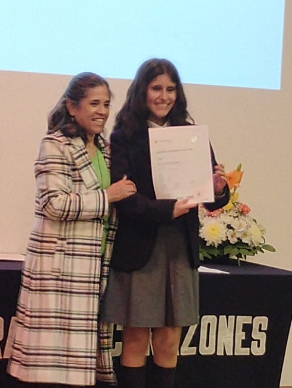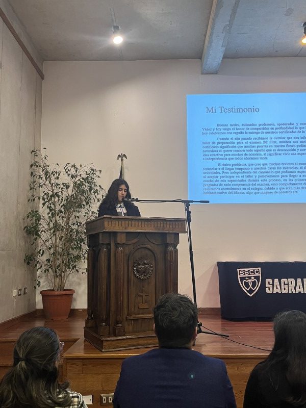 Con una excelente pronunciación en inglés, una de las estudiantes certificadas, Monserrat Olave Yáñez del 4° B, describió el proceso vivido, haciendo mención de sus hitos y compartiendo la profunda alegría por este logro.